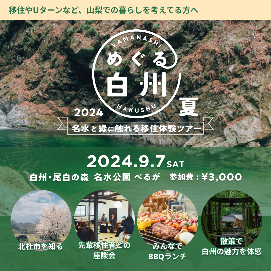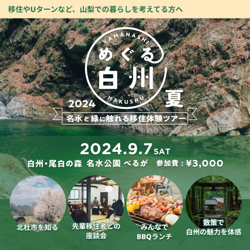 事後アンケートでもたくさん好評の声をいただいた本開催。少しでも白州町の魅力を感じていただけたなら幸いです。9月7日(土)には、さらにそのポテンシャルを肌で感じていただけるよう、白州町現地で「めぐる白州 2024夏〜名水と緑に触れる移住体験ツアー」を開催します。自然の中でのびのびと過ごす1日を通じて、未来の暮らしを考えるきっかけをご提供。名水百選の尾白川や南アルプスの山々を散策しながら、ゲストスピーカーの移住体験談を聞くことで、実際の移住生活をリアルにイメージしていただけるイベントとなっています。