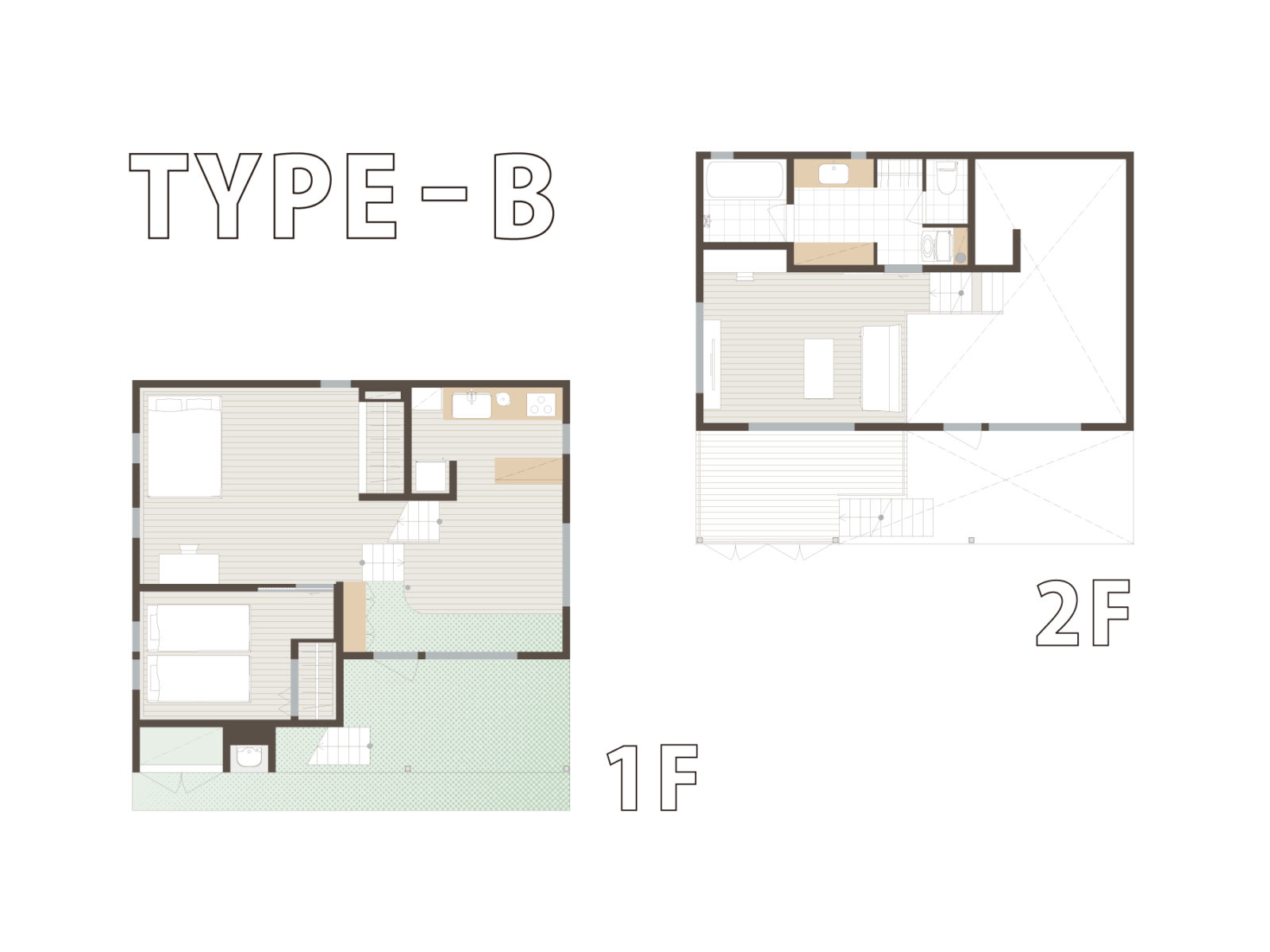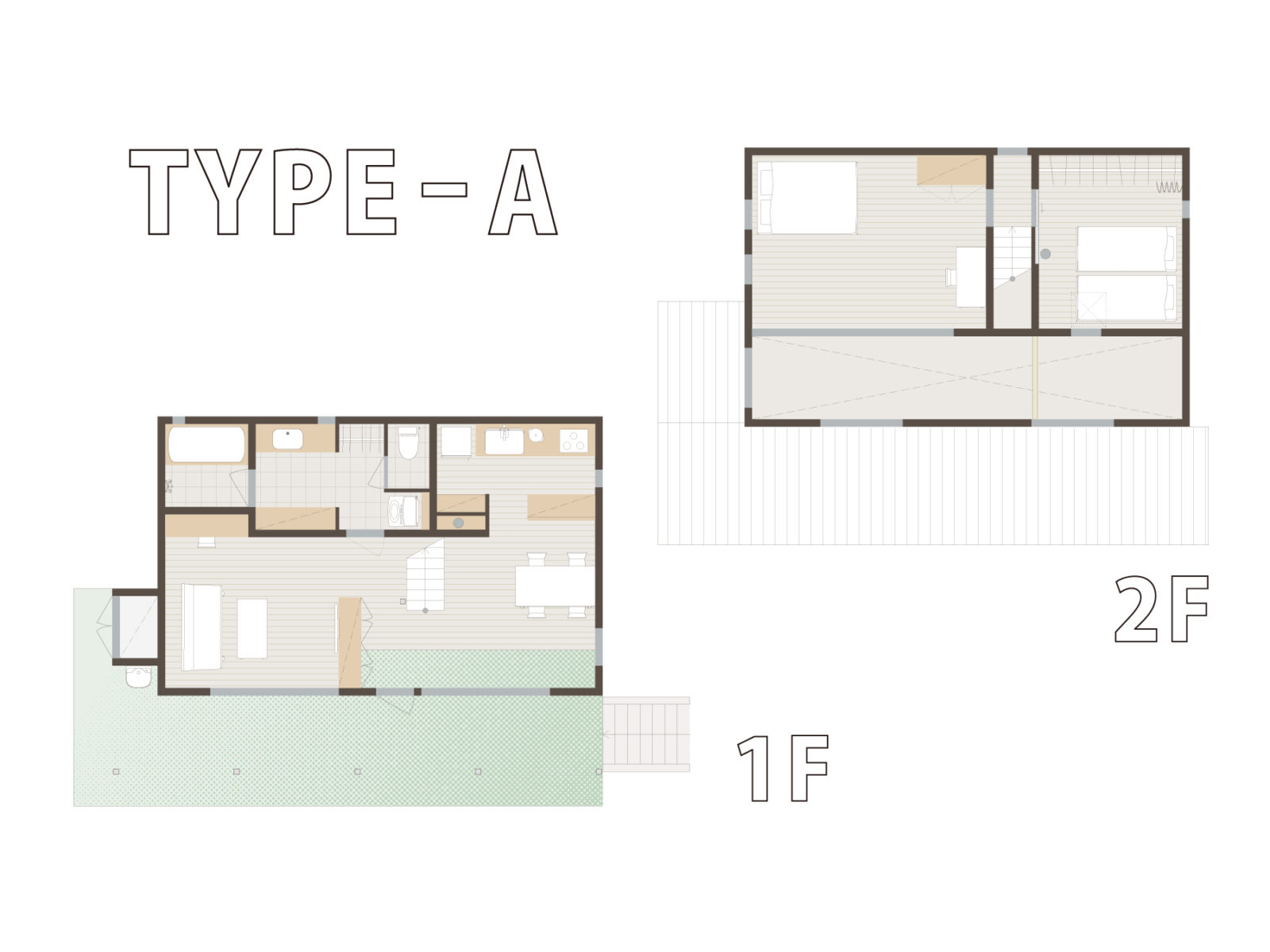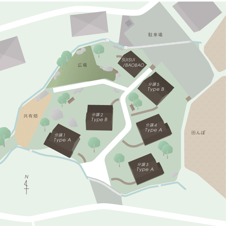 CHIME白州は現代的な村のような、顔の見える距離感を大切にして設計された分譲住宅です。店舗棟や共用畑など、自然と交流が生まれる「コモンスペース」を備えた2700平米の敷地に、[タイプA・B]とプランの異なる5戸の分譲住宅が寄り添うように立ち並びます。