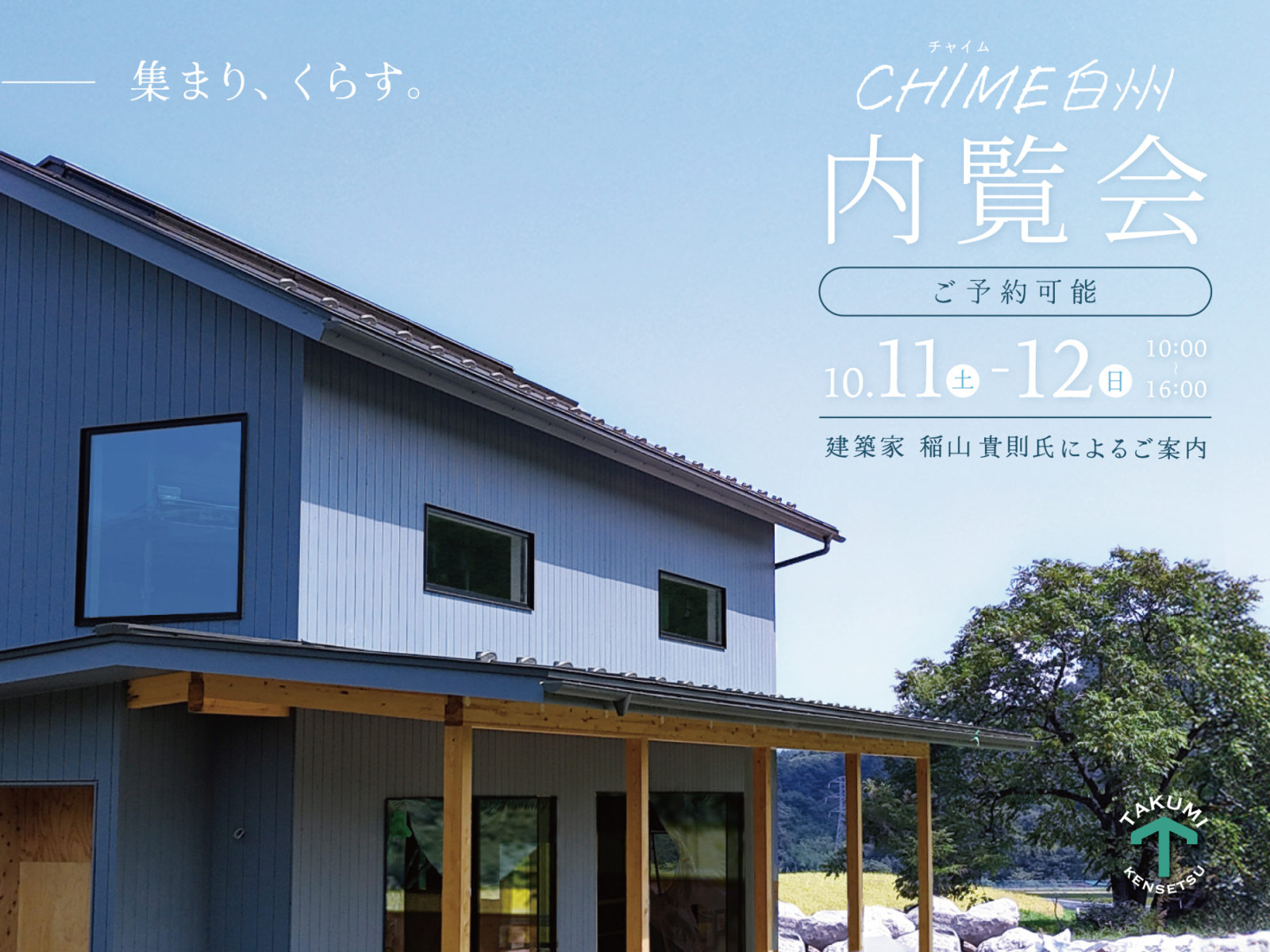 山梨県北杜市を拠点に地域に根差した老舗建設会社「株式会社 巧光建設(たくみ建設)」は、同市白州町(はくしゅうちょう)において『集まり、くらす』ことをコンセプトとする分譲住宅「CHIME白州(チャイムはくしゅう)」の一部住宅が完成いたしました。これに伴い10月11日(土)、12日(日)に内覧会を開催いたします。