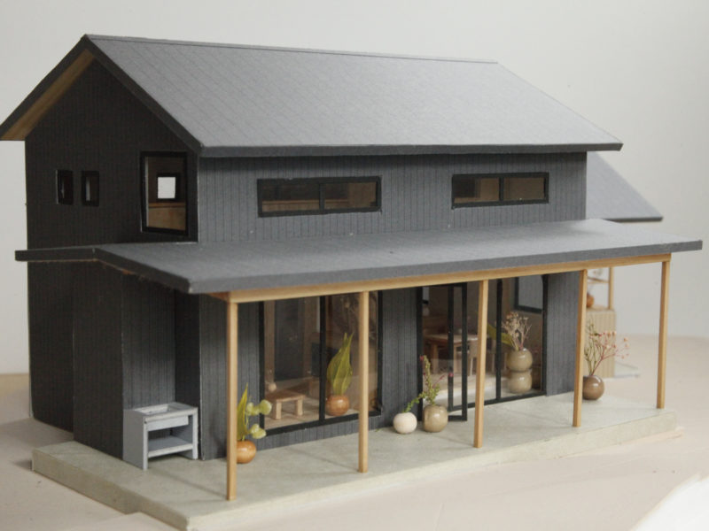 大きな軒下空間を設計した2階建て住宅。間仕切りを設けないリビング・ダイニングと、一部を吹き抜け構造にした天井が開放感を演出しつつ、上階には寝室に加え、将来子ども部屋としても仕切ることのできる部屋を設けています。