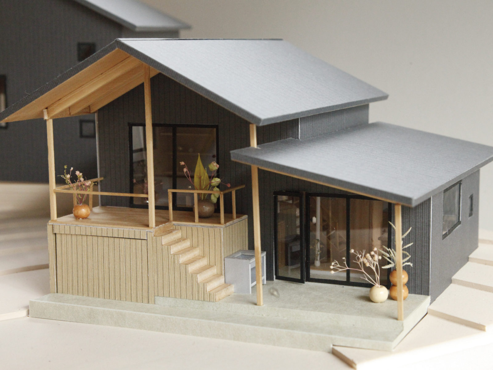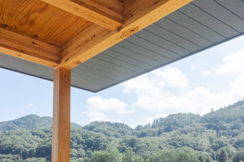 TYPE-A・Bの2種類のプランを持つ5戸の分譲住宅は、グレーを基調としたシックな外観に、山梨県産の木材を活用した建材の温かみを感じる居住空間が設えられています。前面へ長く伸びる軒下には広々としたスペースを確保し、玄関は日本古来の土間をイメージしたゆとりある設計に。リビングへの境界壁を設けず、大きなガラス戸を開放することで、屋内と軒下がつながる開放的な空間を生み出しています。また、空気集熱式ソーラーシステムを導入し、太陽熱を生かすことで暖かい住居としました。